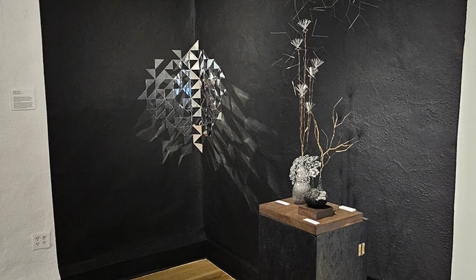 Materiality dissolves with this subtle site specific gallery installation. Nestled within the corner of the gallery, the old adobe walls appear to fragment and disappear. Utilizing pixelated mirror fragments (Polystyrene Material) situated along the full height of a wall corner, the chaotic yet controlled layout disorients one understanding of space and structure.
